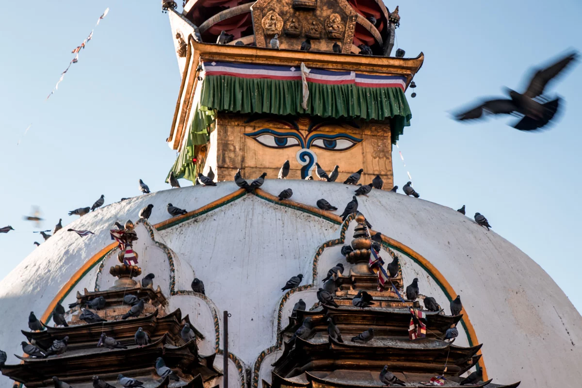 สถูปสีขาว รายล้อมด้วยเจดีย์สีดำๆอีกหลากหลายคับ และยังมีนกพิราบด้วยครับ นกเยอะมาก คนที่นี่ก็ชอบให้อาหารนกด้วย สำหรับใครที่มาหลายคนน่าจะชอบเวลาถ่ายภาพกับนกพิราบตอนที่มันบิน ผมว่าสวยเลยแหละ วัยรุ่นที่นี่ก็วิ่งไล่นกเพื่อเก็บภาพกันสนุกสนาน นักท่องเที่ยวแบบผมก็ยืนมองด้วยความสนใจใสสิ่งแปลกใหม่ในพื้นที่ต่างแดน