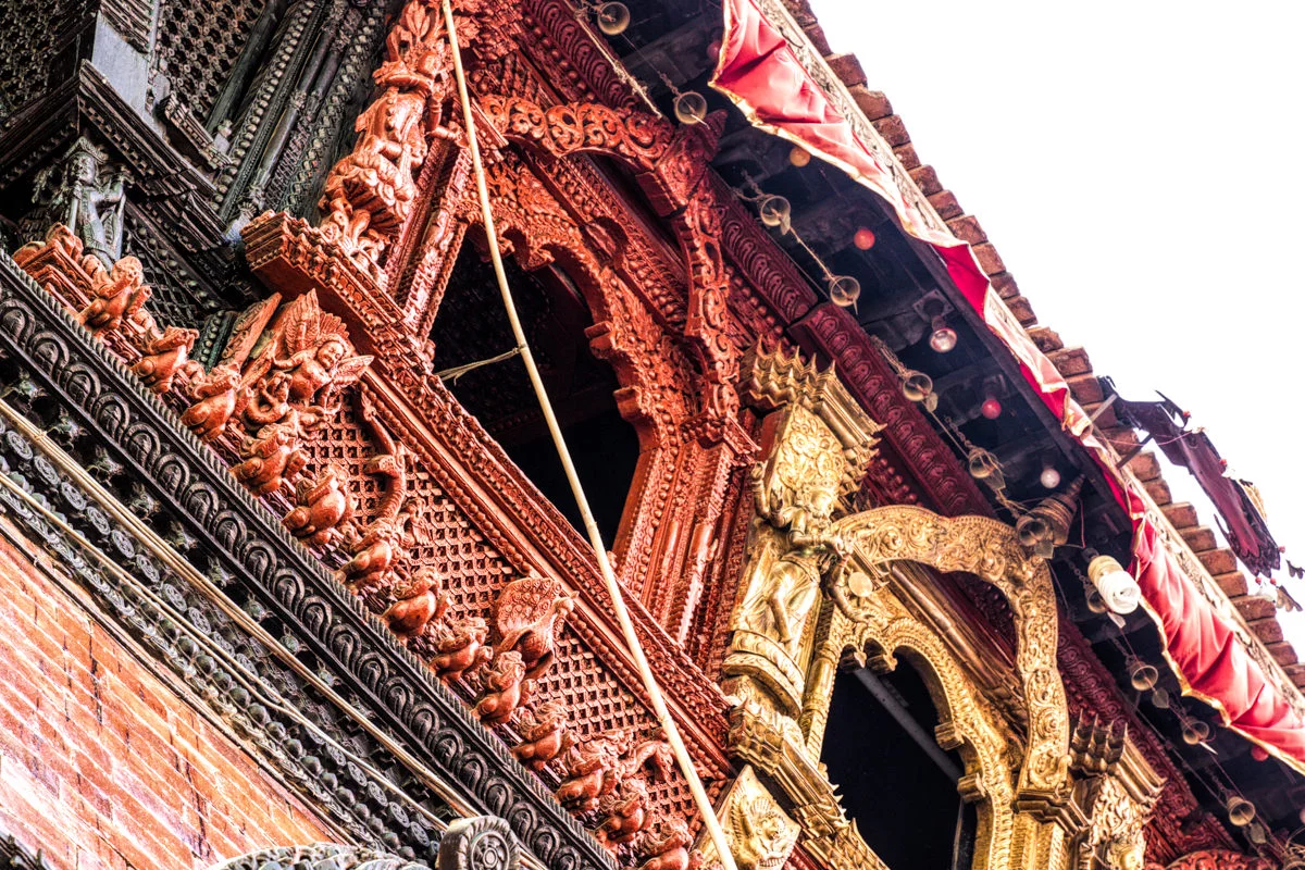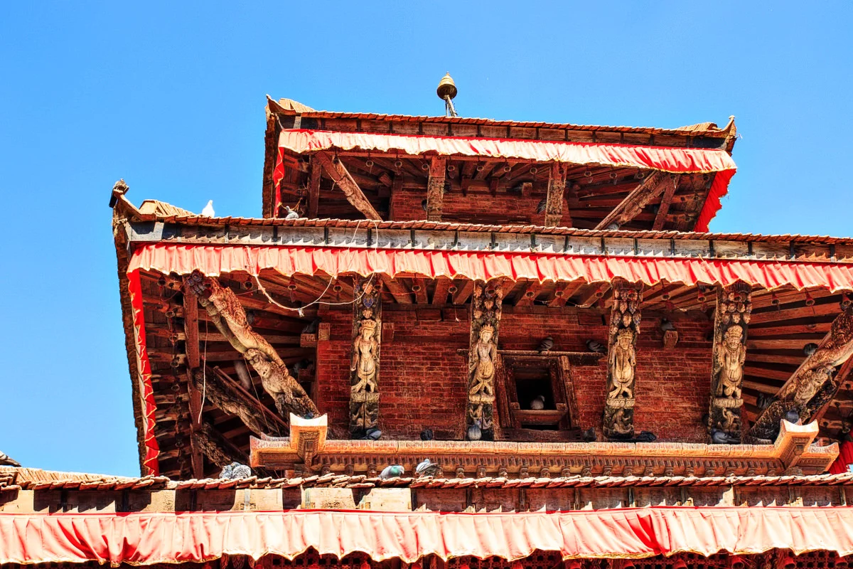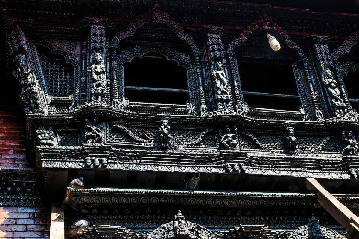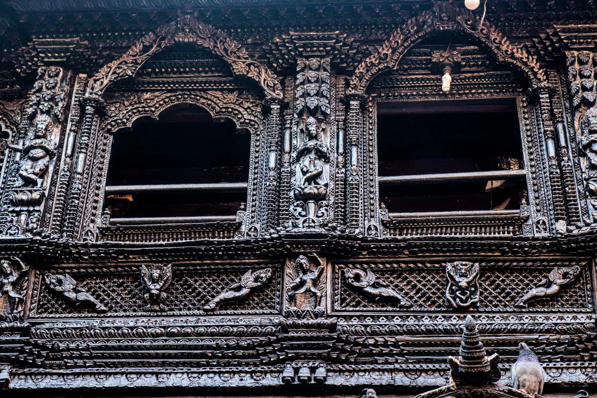 “อาคารนี้เต็มไปด้วยภาพแกะสลักกามาสูตรา” ผมอ่านถึงบรรทัดนี้แล้วก็สะดุดกึก อยากจะรู้ว่าพูดถึงอาคารไหน ก็เลยลองอ่านดูดีๆ ก็ปรากฎว่าเป็นอาคารที่นกพิราบลงมาเยอะๆนั่นแหละครับ ผมก็รีบเดินดุ่ยๆ ออกไปดูว่ากามาสูตราที่ว่าเป็นอย่างไร พอเห็นแล้วก็โอ้โห โบ๊จั้มโบะ เป็นภาพแกะสลักไม้ในท่าทางของการร่วมเพศครับ แหม่ น่าสนใจขึ้นมาละสิ ฮ่าๆ เหตุผลที่เขาแกะสลักเป็นเรื่องราวของกามาสูตราก็เพราะว่าในสมัยก่อนนั้นคนเนปาลแต่งงานกันตั้งแต่อายุยังน้อยครับ จึงให้มาเรียนรู้เรื่องเพศผ่านงานแกะสลักพวกนี้