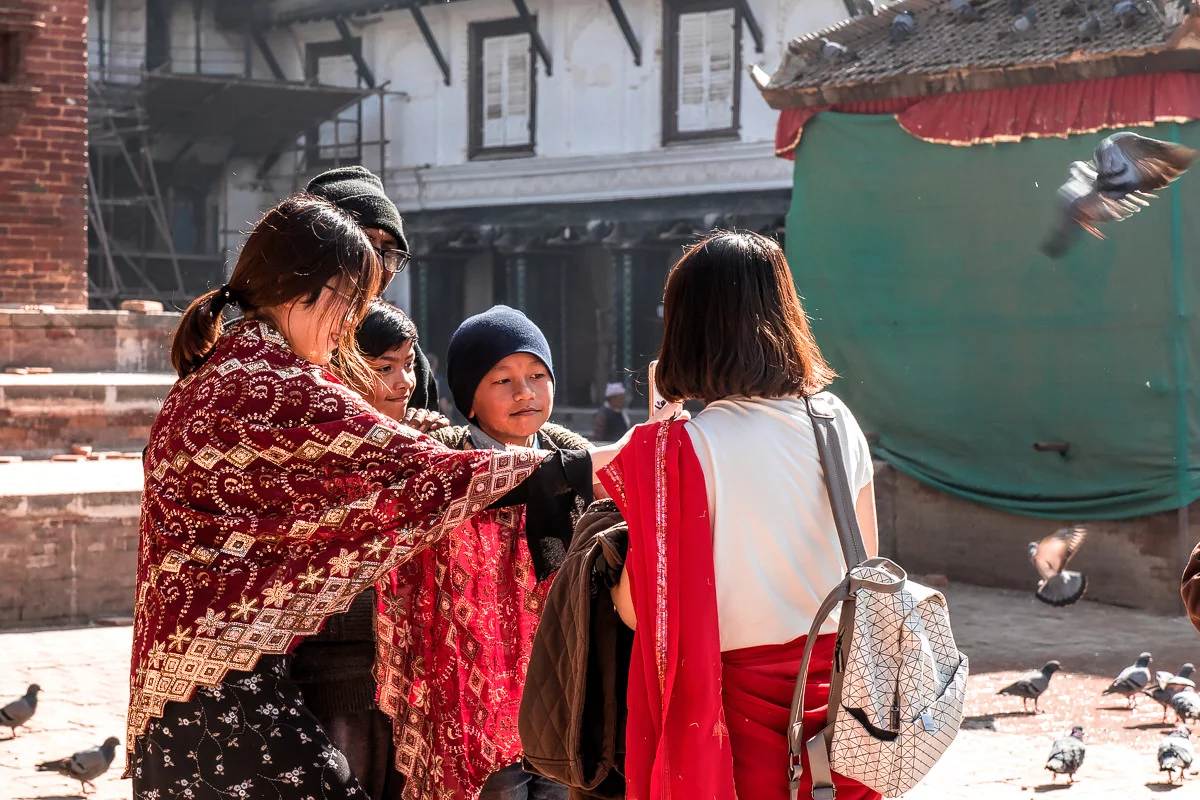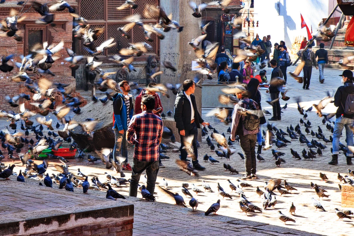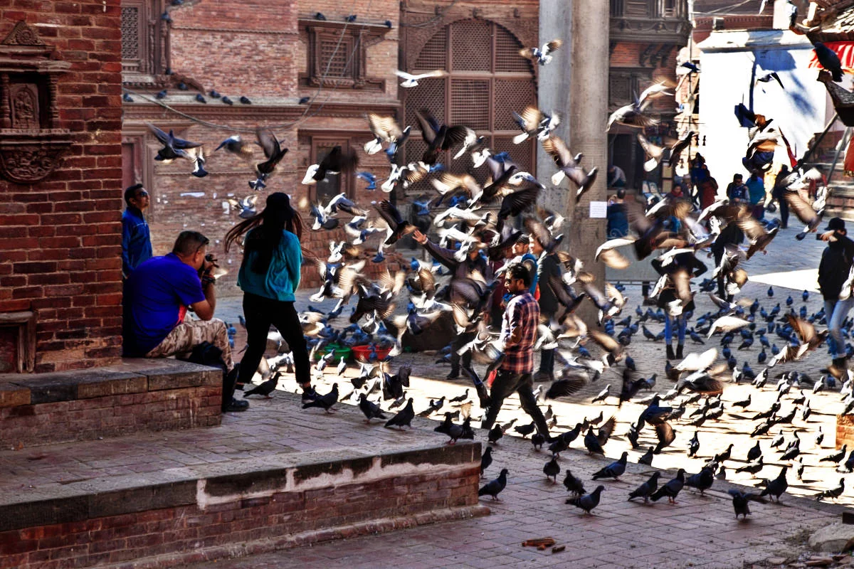 ที่แห่งนี้มีนกพิราบเยอะมาก เยอะแบบเต็มไปหมด นักท่องเที่ยวบางคนก็ซื้ออาหารให้นกพิราบเพื่อจะได้เรียกนกมาหาเยอะแล้วก็เดินให้มันกระพือปีกบินหนี ก็ยิ่งสวยงามสำหรับคนชอบถ่ายภาพ และที่นี่ผมก็เจอสองสาวชาวจีนที่ผมเจอเมื่อตอนเช้าครับ พวกเธอแปลงกายเป็นสาวเนปาลไปแล้ว ผมก็เข้าไปทักทายเธอ เธอสองคนก็ดีใจมาก บอกว่าดีใจมากที่ได้เจอกันอีก ทั้งๆที่เราก็เพิ่งแยกจากกันไม่นาน